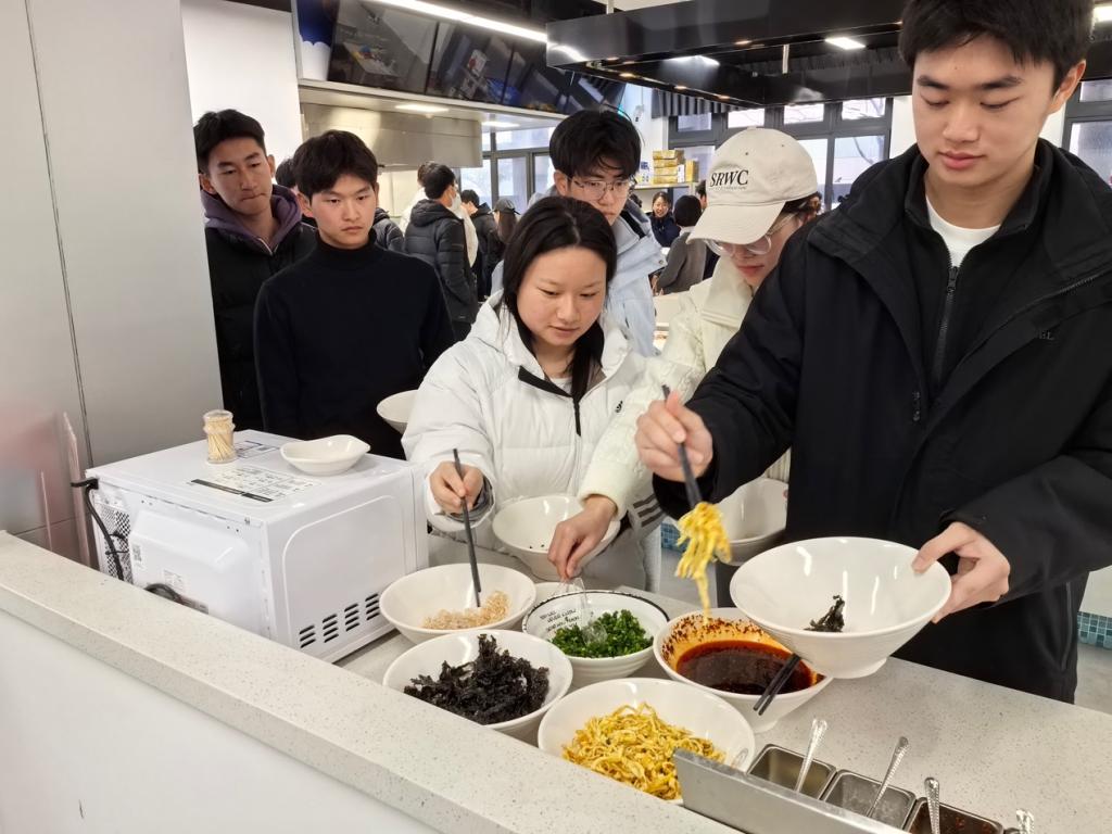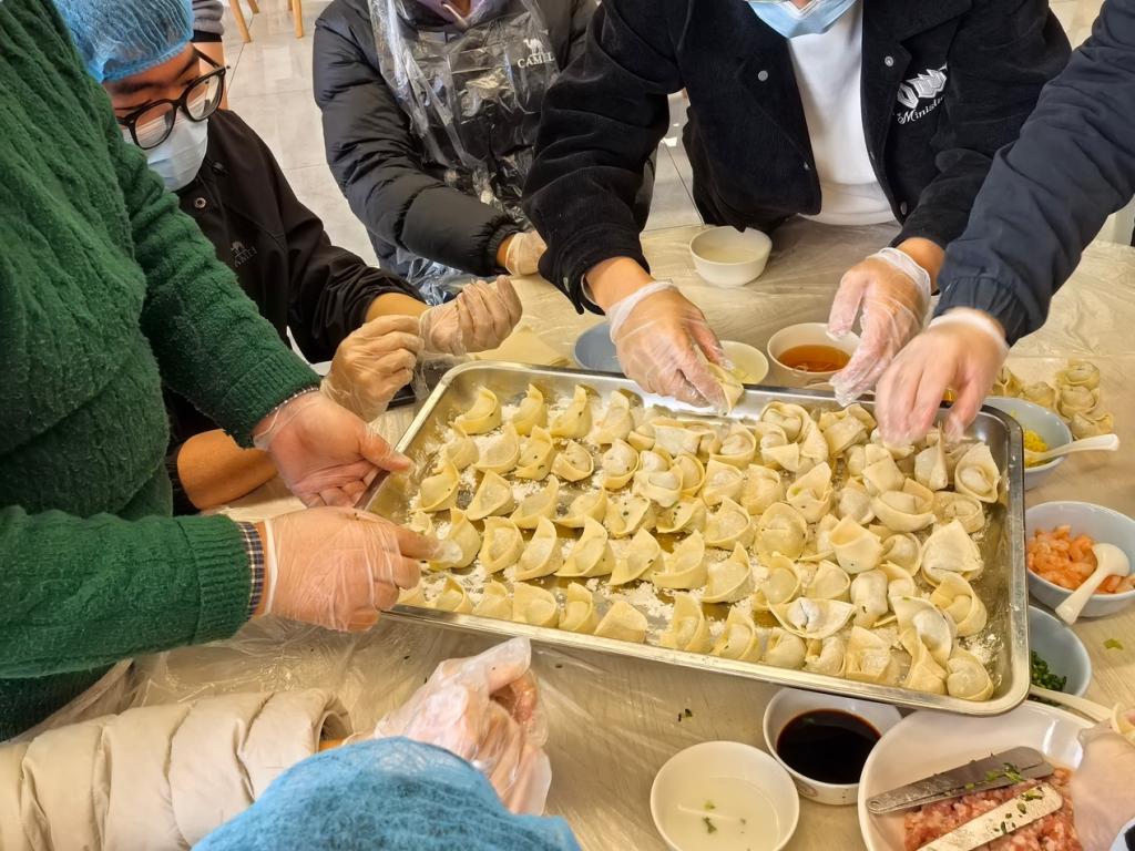 随后,师生们将包好的馄饨交由食堂工作人员统一煮制,指导老师同步讲解煮制过程中的火候把控、时间掌握等关键要点,让大家完整掌握从食材处理到成品出锅的全流程技艺。当热气腾腾的馄饨陆续端上桌,师生们品尝着自己亲手制作的劳动成果,脸上洋溢着满满的成就感与幸福感,现场氛围温馨而热烈。