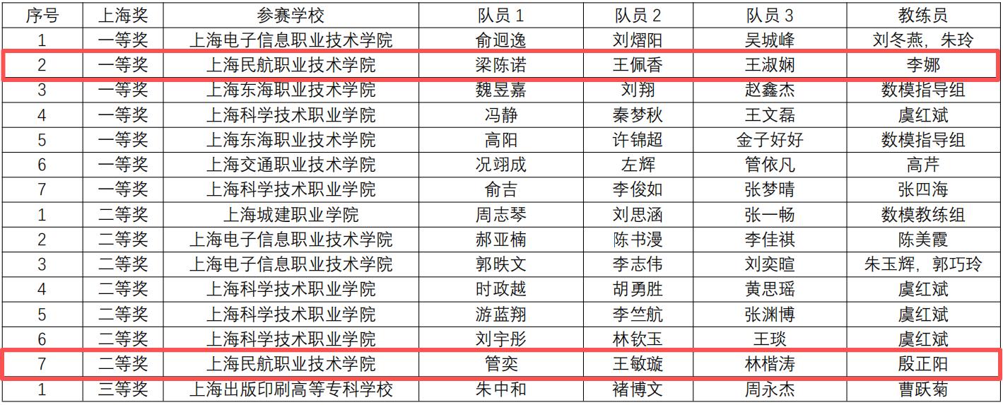 近日,由教育部高等教育司和中国工业与应用数学学会联合主办的2025年“高教社杯”全国大学生数学建模竞赛获奖名单公布。此次竞赛我院由公共基础学院李娜老师和学生工作处殷正阳老师指导的队伍分别荣获高职高专组全国二等奖、上海市一、二、三等奖共4项奖项。