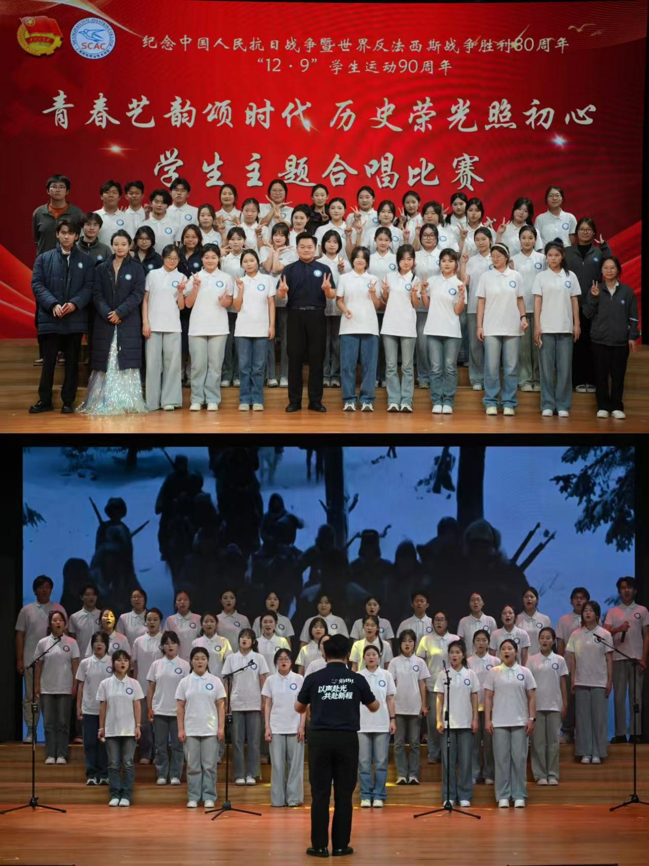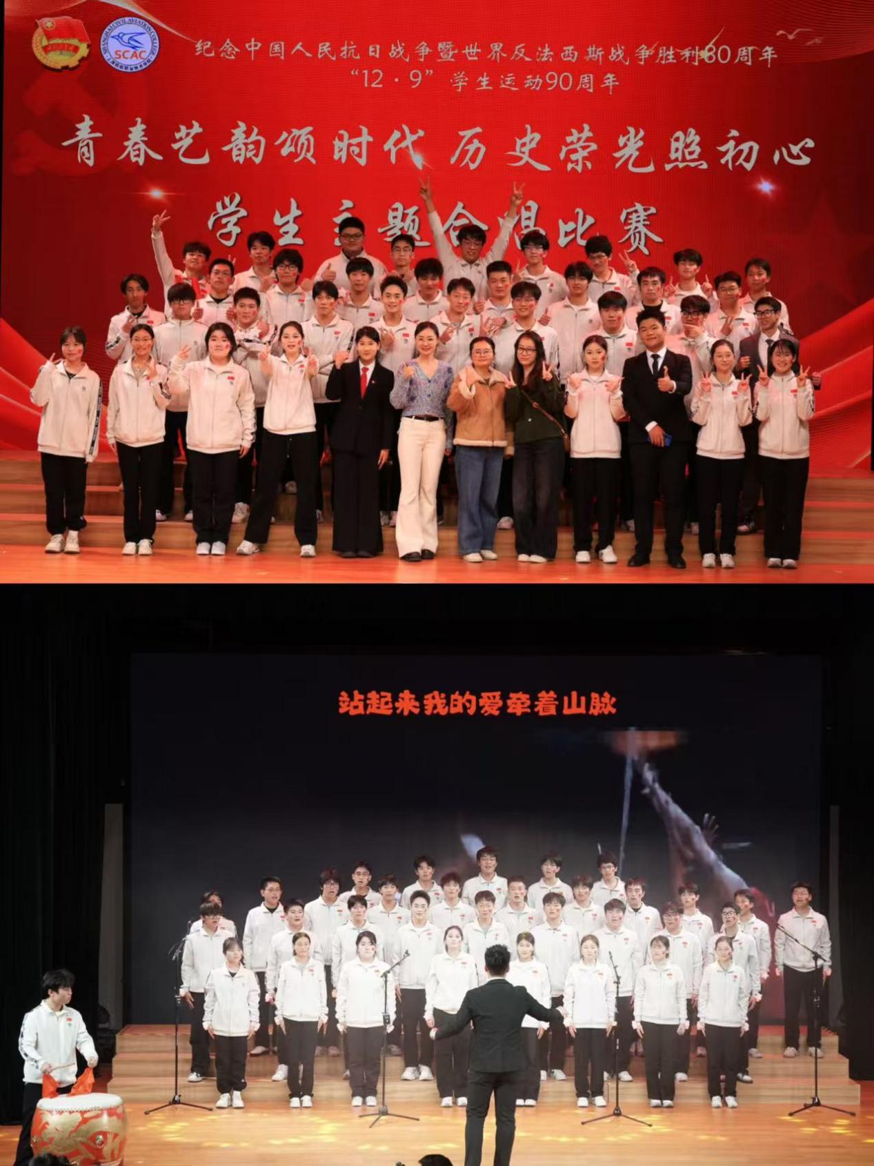各学院代表队先共同演绎规定曲目——纪念抗战胜利80周年青春传承曲《山河》,以青春之声勾勒祖国壮丽画卷;随后在自选曲目环节各展风采,带来一场视听盛宴。